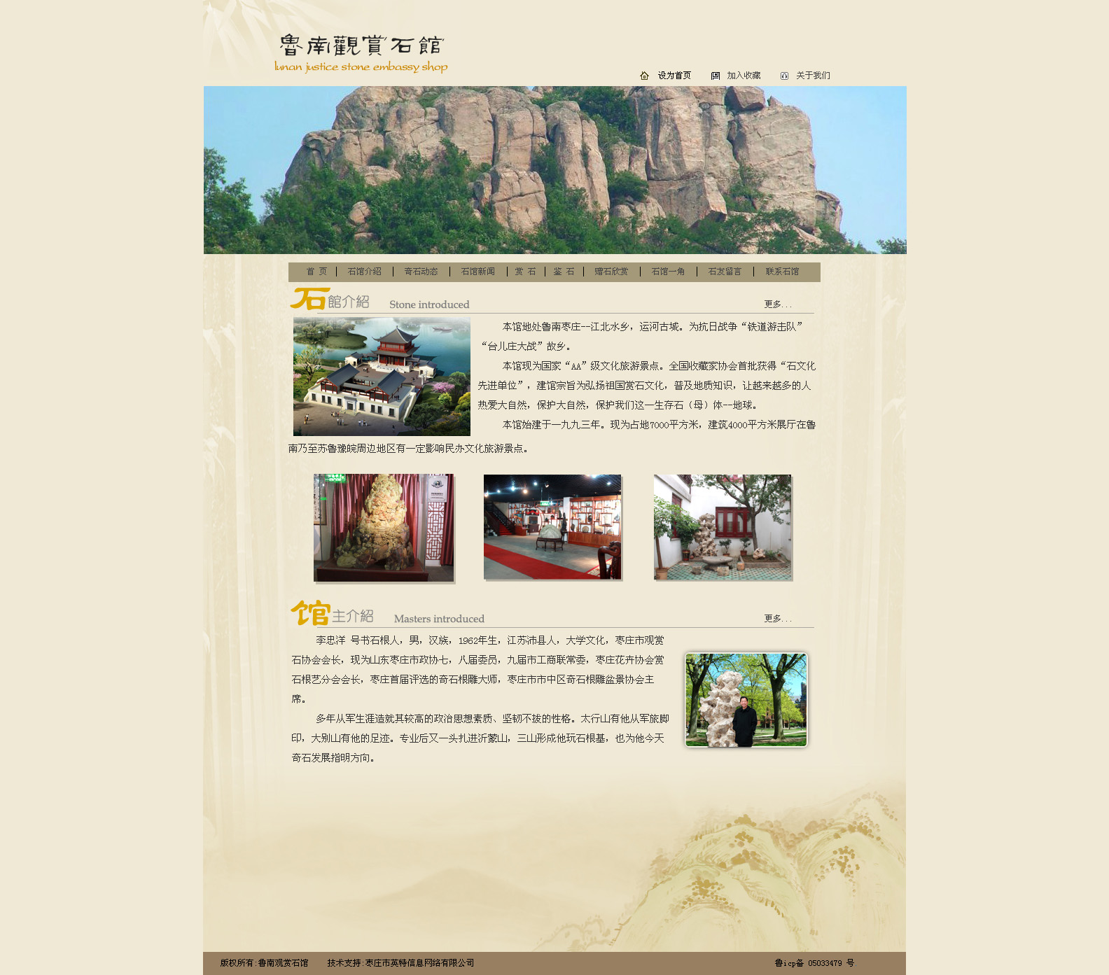 本館地處魯南棗莊--江北水鄉(xiāng),運河古城。為抗日戰(zhàn)爭“鐵道游擊隊”“臺兒莊大戰(zhàn)”故鄉(xiāng)。 本館現(xiàn)為國家“AA”級文化旅游景點。全國收藏家協(xié)會首批獲得“石文化先進單位”,建館宗旨為弘揚祖國賞石文化,普及地質知識,讓越來越多的人熱愛大自然,保護大自然,保護我們這一生存石(母)體--地球。
