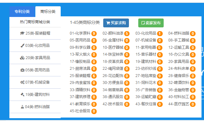 3.您也可以直接進(jìn)入專(zhuān)利商城或者商標(biāo)商城,直接在商城里通過(guò)關(guān)鍵字搜索,或者通過(guò)類(lèi)別查找,亦或者直接瀏覽平臺(tái)推薦,找到合適自己的專(zhuān)利商標(biāo);