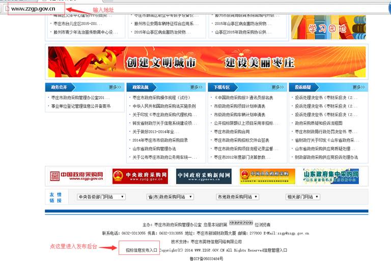 1、      登陸棗莊市政府采購網(wǎng)地址:http://www.zzgp.gov.cn/  拉到網(wǎng)頁下邊: