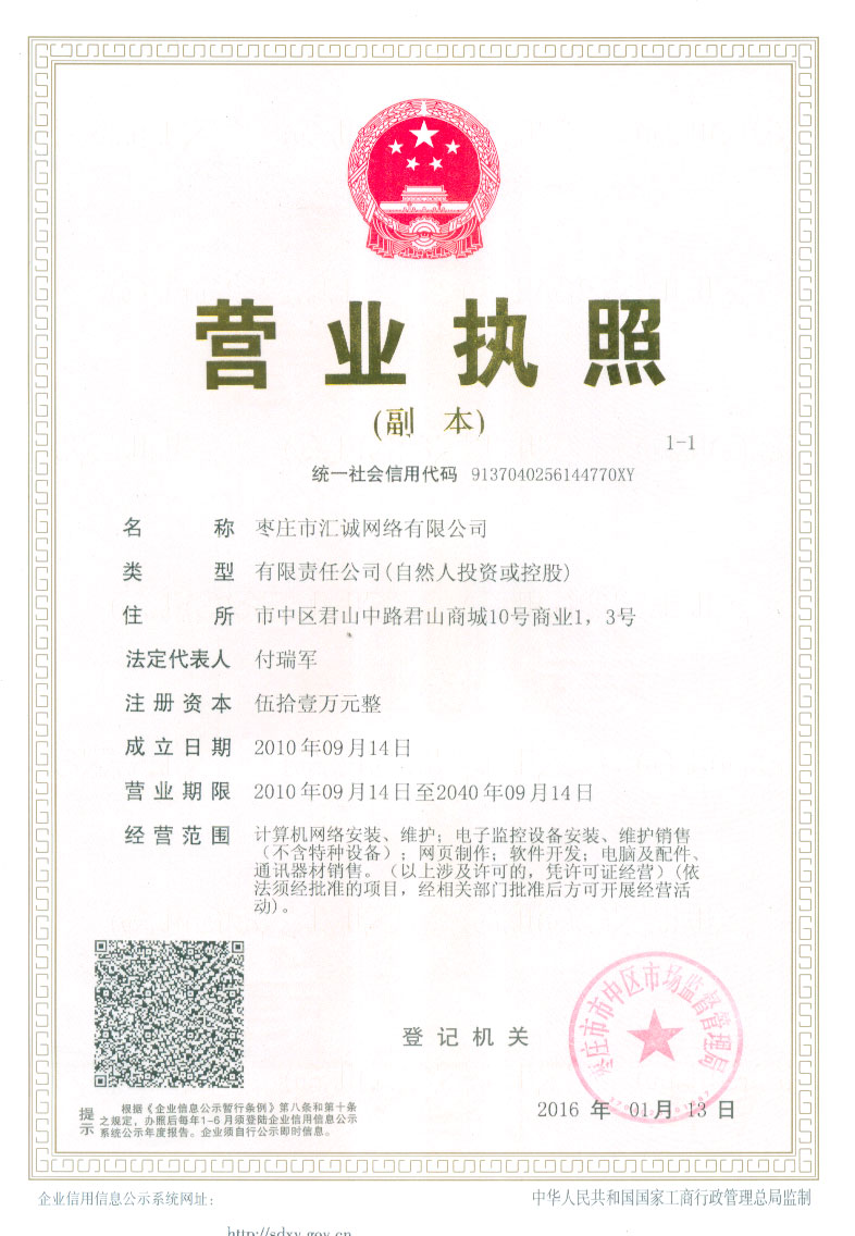 特提供三證合一后的新營業(yè)執(zhí)照副本如下 棗莊市匯誠網(wǎng)絡有限公司營業(yè)執(zhí)照(統(tǒng)一社會信用代碼:9137040256144770XY)